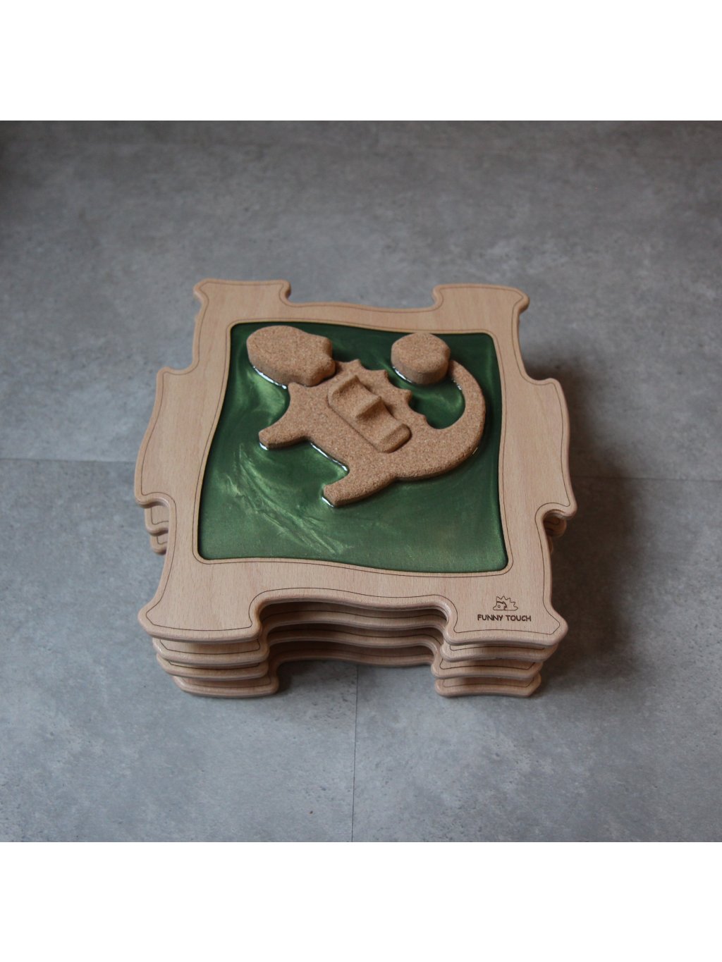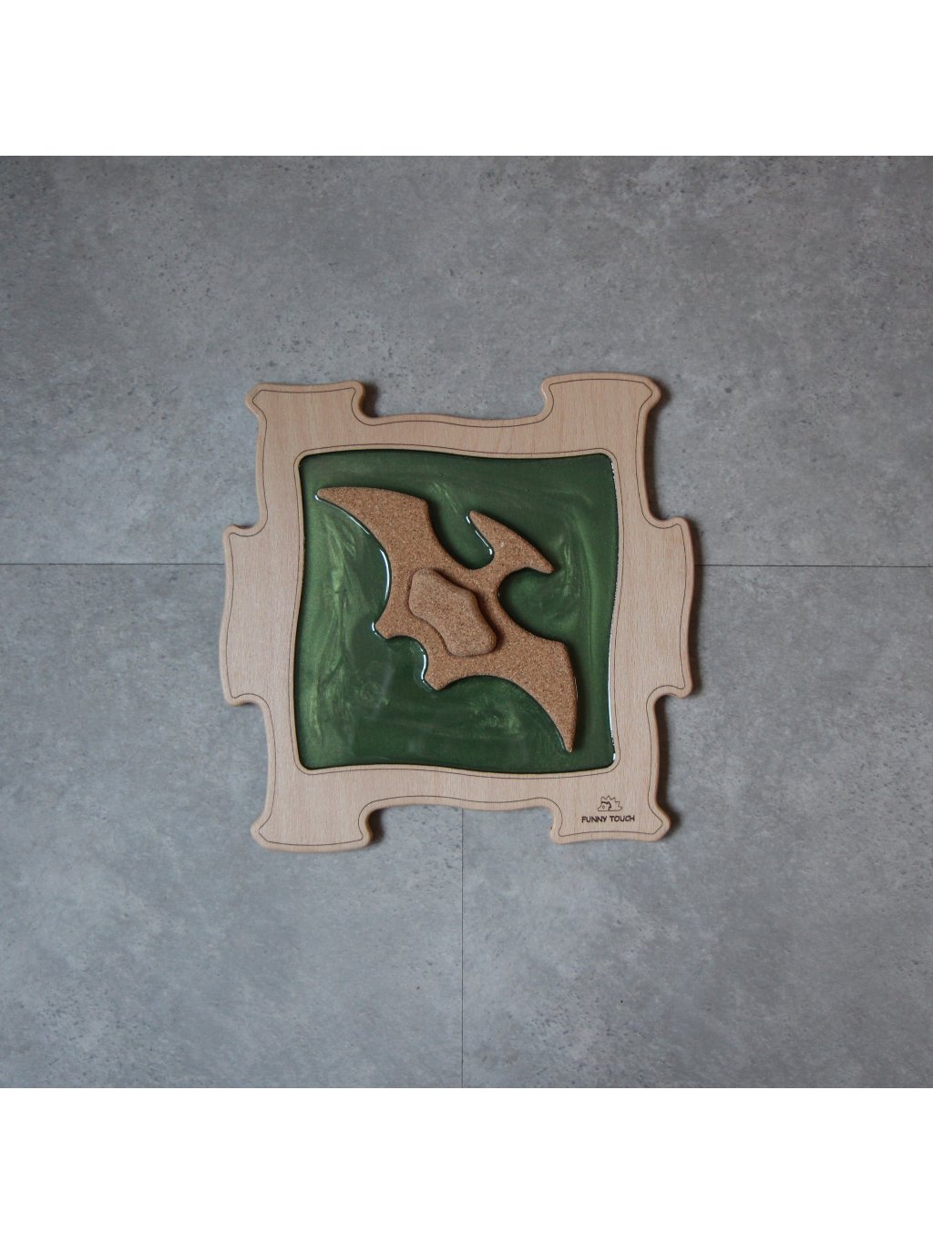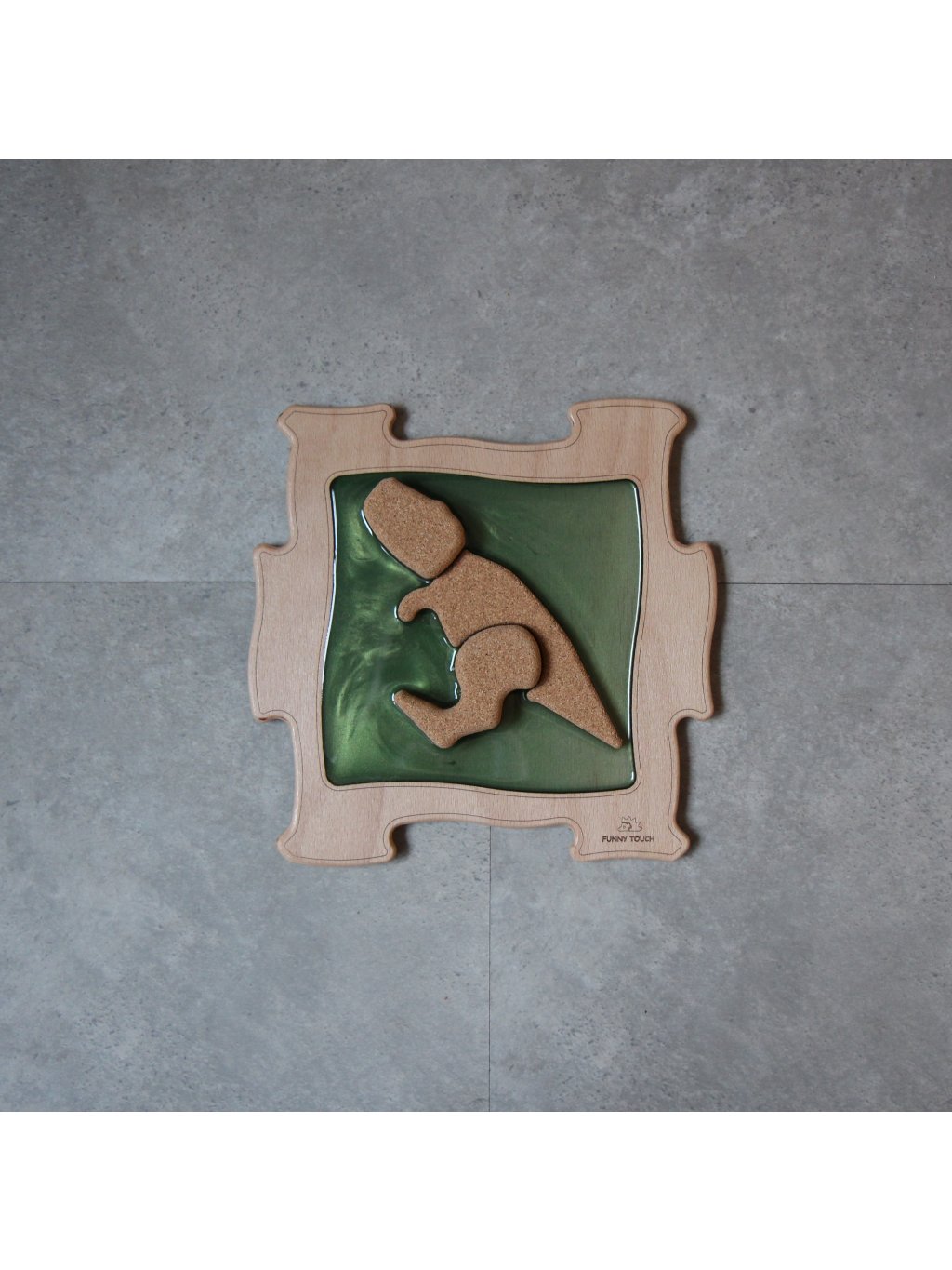 Základ každého dílku tvoří pevné dřevo, které je zalité do pryskyřice pro maximální odolnost a snadnou údržbu. Uvnitř se nachází masážní prvek z přírodního korku, tvarovaný podle jednotlivých dinosaurů. Různorodost tvarů zajišťuje střídání tlaku při chůzi, aktivuje prsty i plosku a pomáhá zapojovat odlišné svalové skupiny. Tím se přirozeně podporuje klenba nohy, rovnováha i celková stabilita těla.