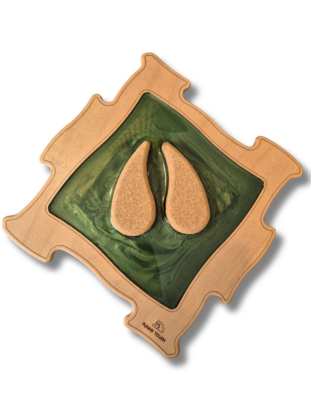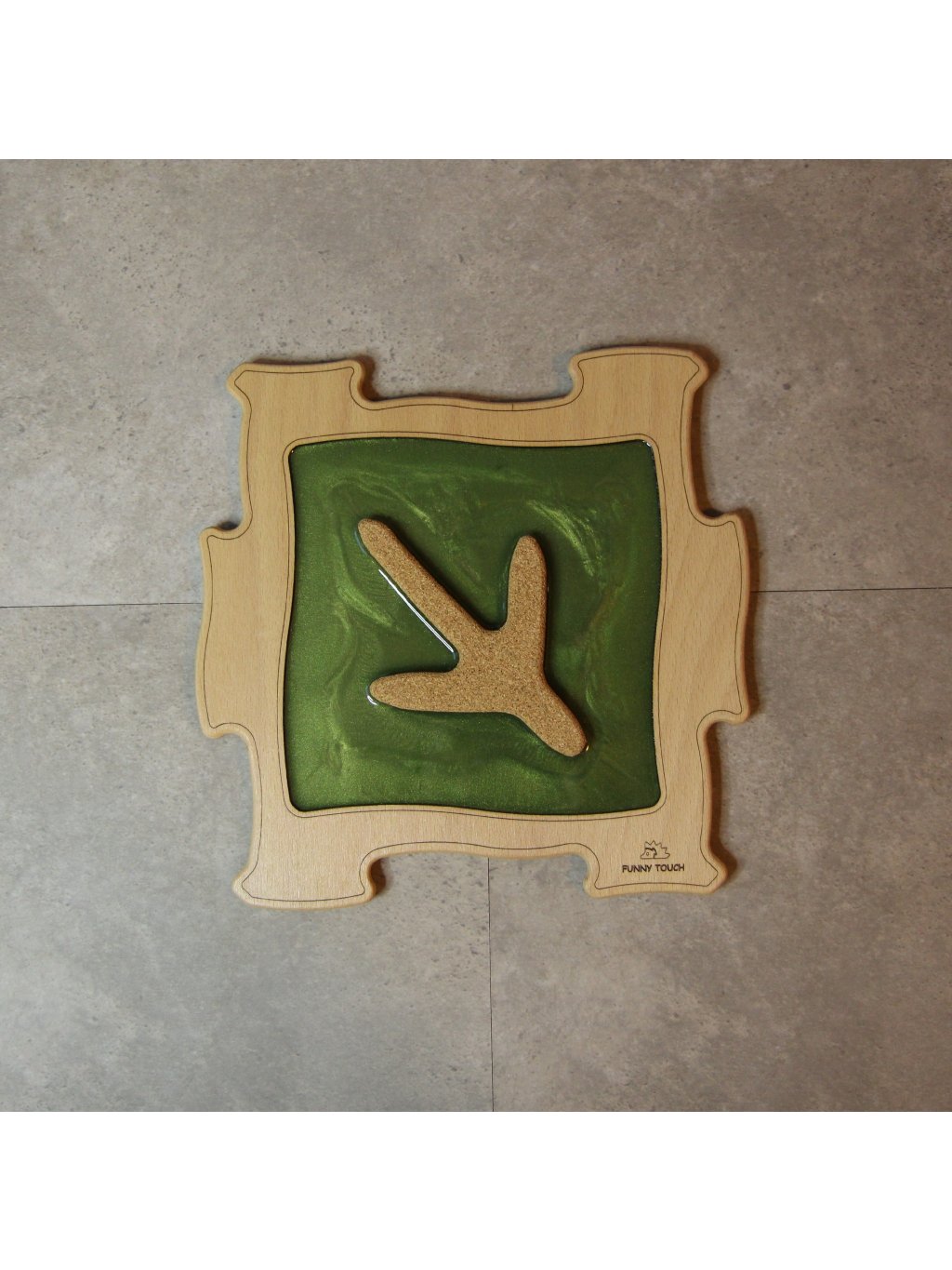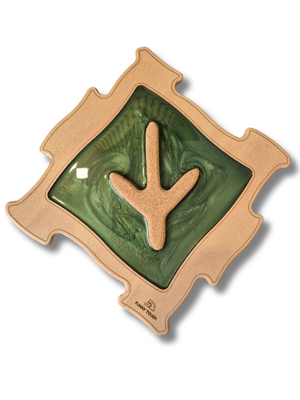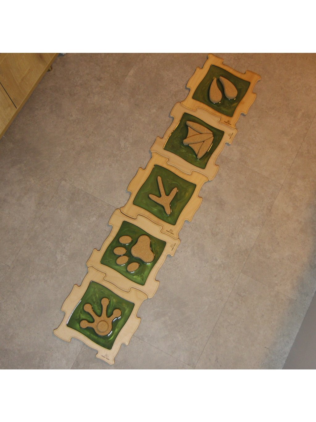 Stopy jsou vyrobeny z přírodního korku, který je příjemný na dotek a poskytuje jemnou, ale účinnou stimulaci chodidel. Při chůzi po jednotlivých stopách děti aktivují plosky nohou, zapojují prsty a přirozeně rozvíjejí rovnováhu, koordinaci i stabilitu. Puzzle tak podporuje zdravý vývoj chodidel a správné držení těla nenásilnou, hravou cestou.