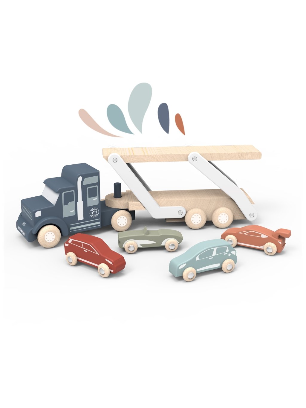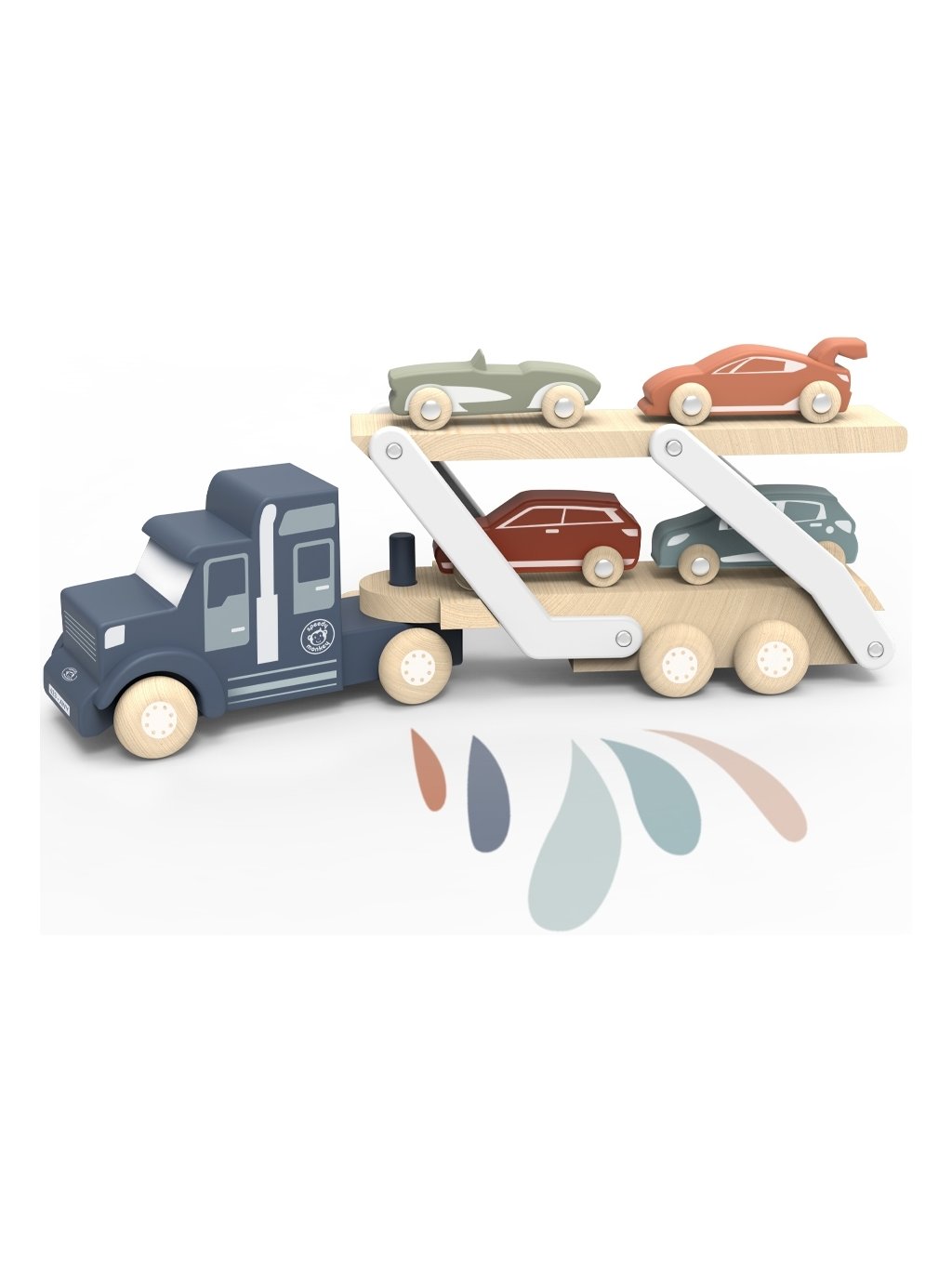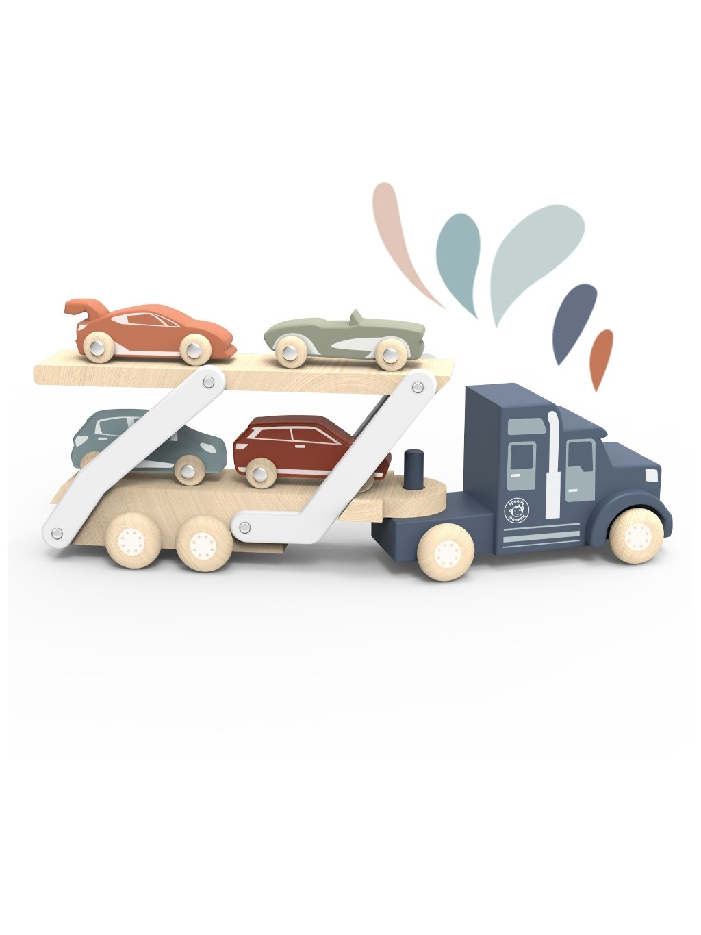 Dřevěný auto transportér od Speedy Monkey přiveze na scénu čtyři barevná, pevná autíčka, která lze snadno naložit i vyložit. Přívěs je navržen se speciálními sloty, aby auta během jízdy zůstala bezpečně na svém místě.