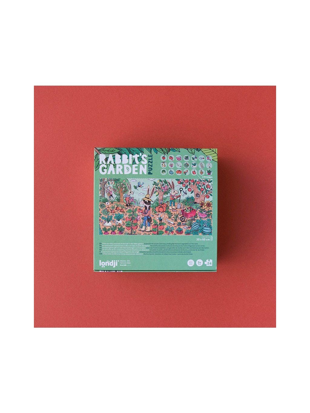 Králíček na své zahrádce pilně pěstuje jahody, saláty, melouny a další dobroty. Děti se mohou přidat a pomoci mu objevit, co všechno se mezi záhonky ukrývá. Nejprve složí 24dílné puzzle s veselou zahradní scénou. Jakmile je obrázek hotový, přichází další dobrodružství. Pomocí pozorovacích kartiček hledají jednotlivé předměty a zkoumají každý detail.