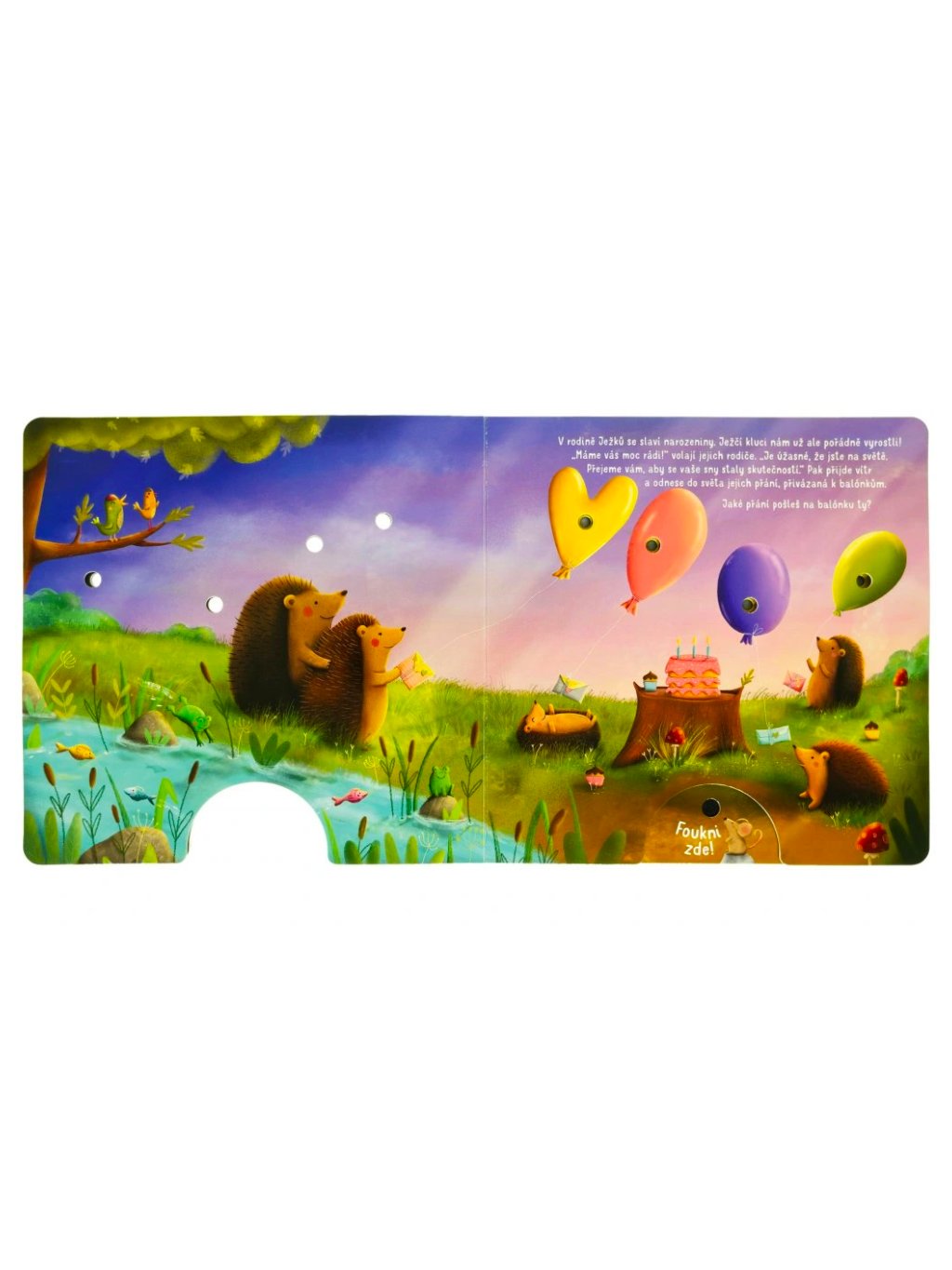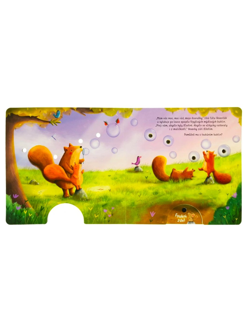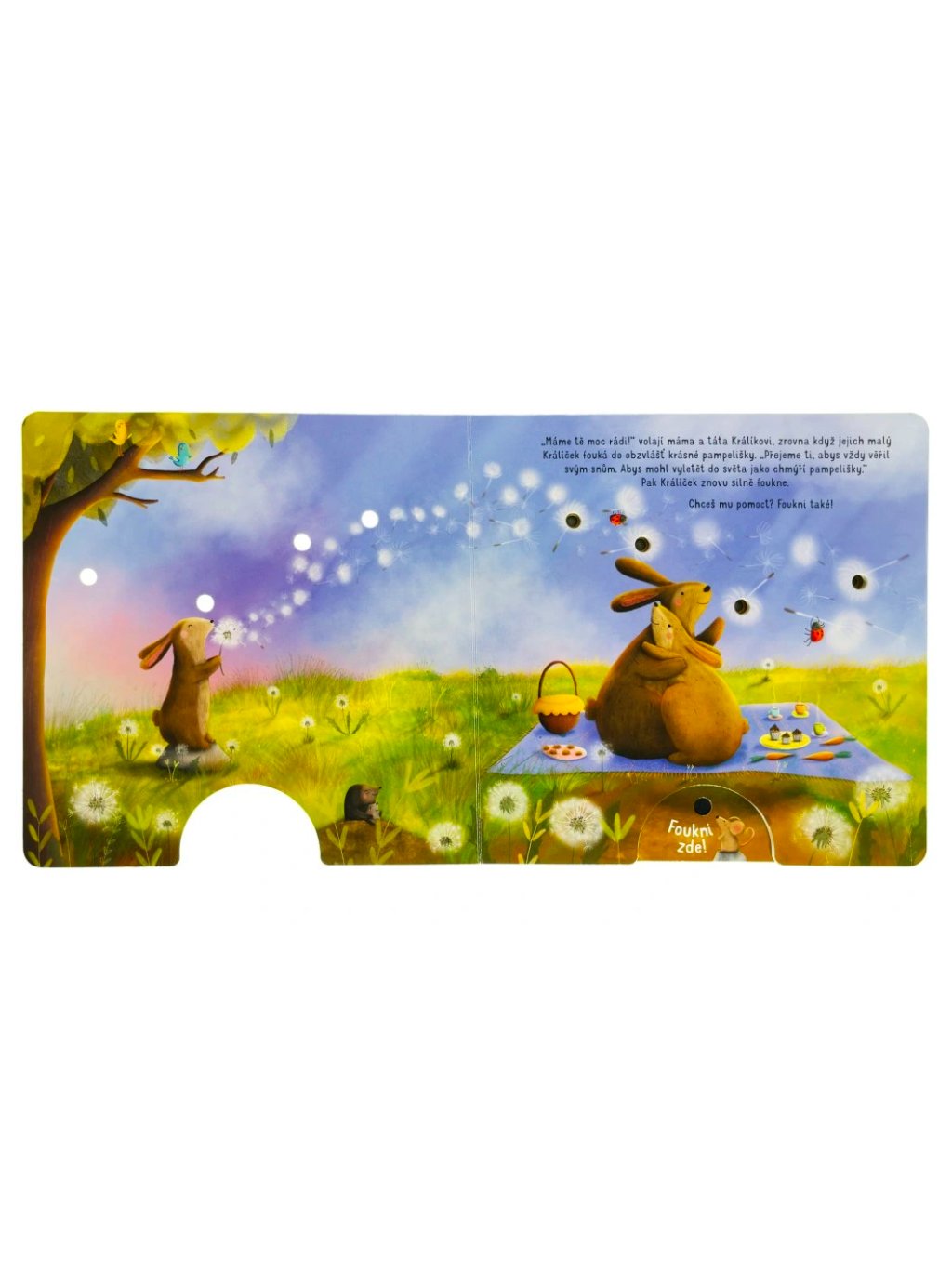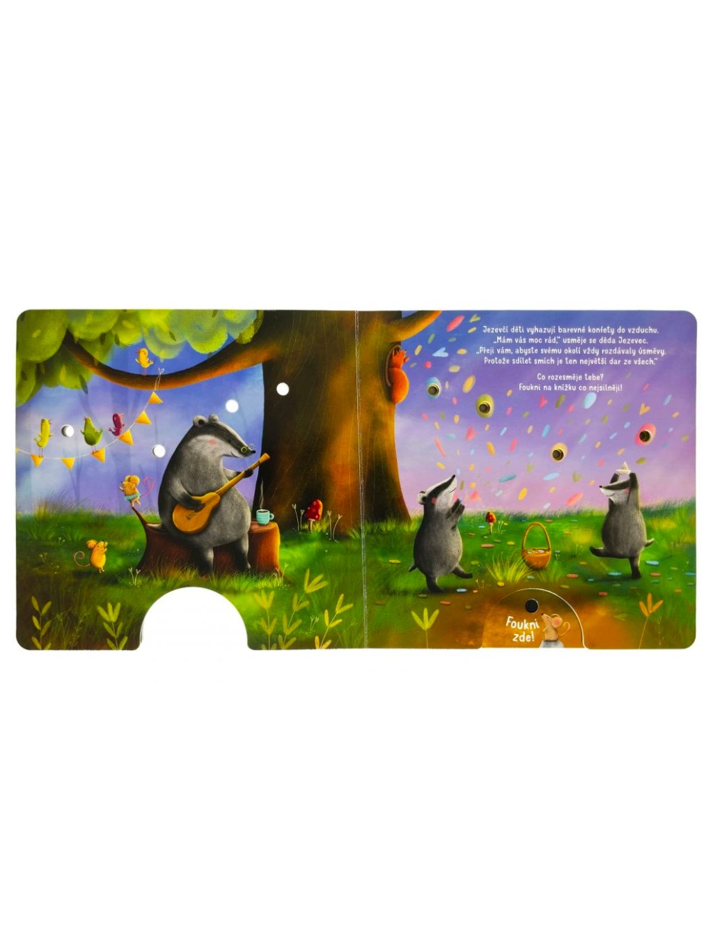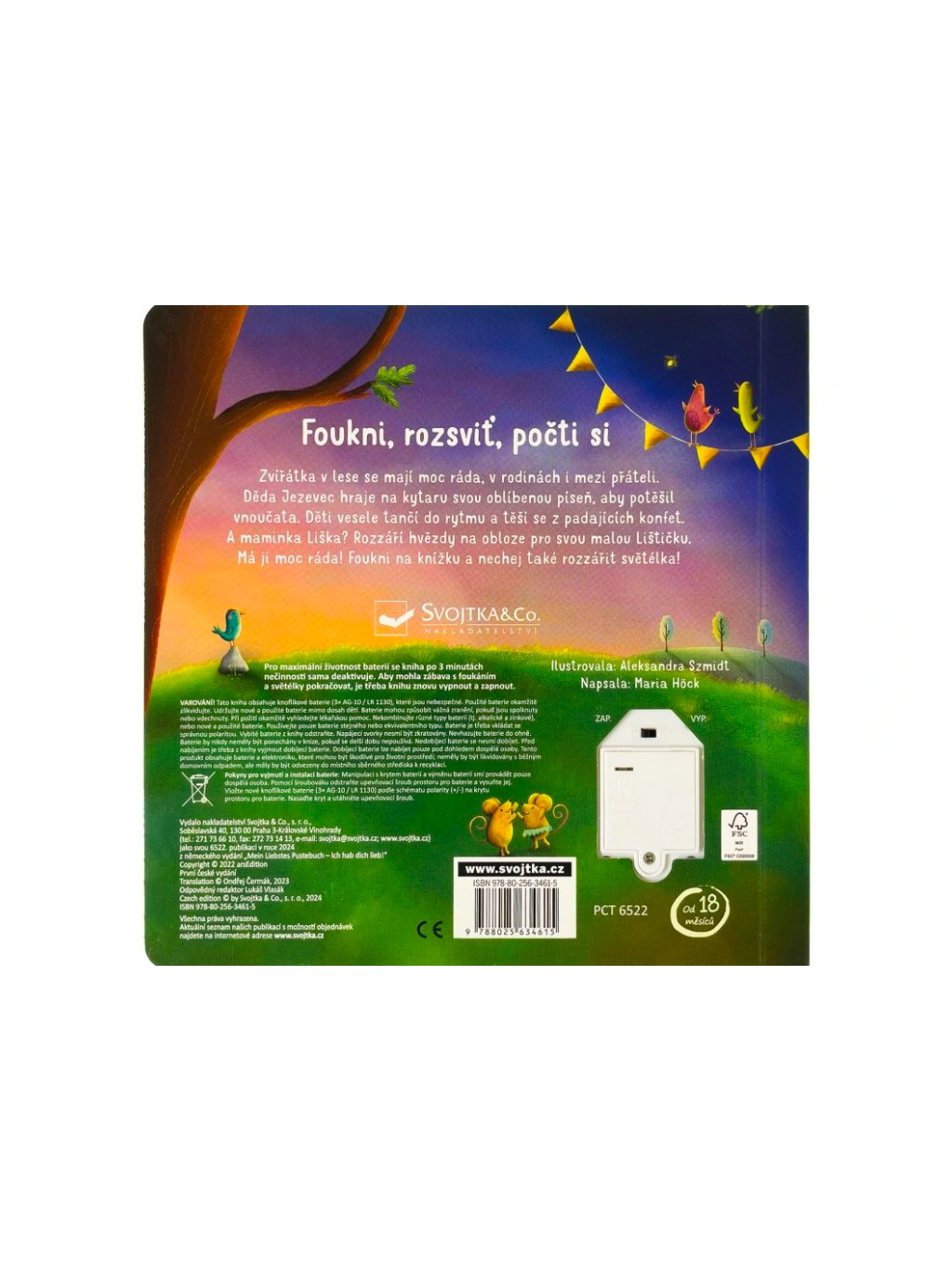 Dědeček Jezevec brnká na kytaru svou oblíbenou melodii, aby potěšil vnoučata. Děti se radostně vlní do rytmu a s úsměvem sledují, jak kolem nich poletují konfety. A maminka Liška? Ta nechá na nebi zazářit hvězdy jen pro svou malou lištičku, protože ji má tolik ráda. Foukněte na knížku i vy a rozsvěťte kouzelná světélka!