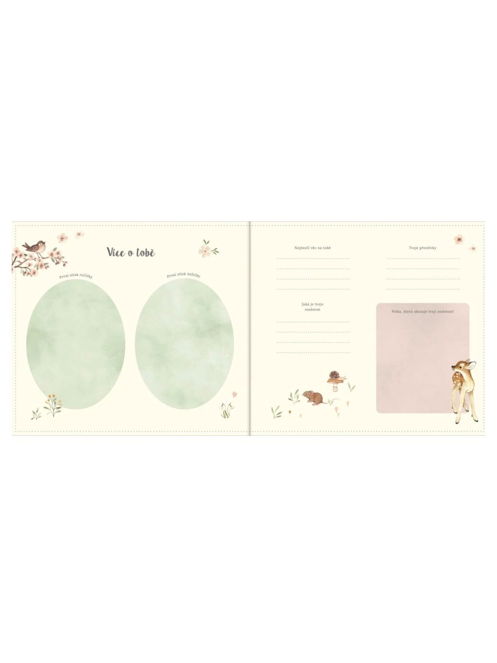 Najdete v něm prostor pro zápisy důležitých dat, milníků, zážitků i vtipných momentů, které nechcete zapomenout. Můžete do něj vlepit fotografie, schovat otisky ručiček a nožiček a využít dvě speciální obálky, ideální pro drobné poklady.