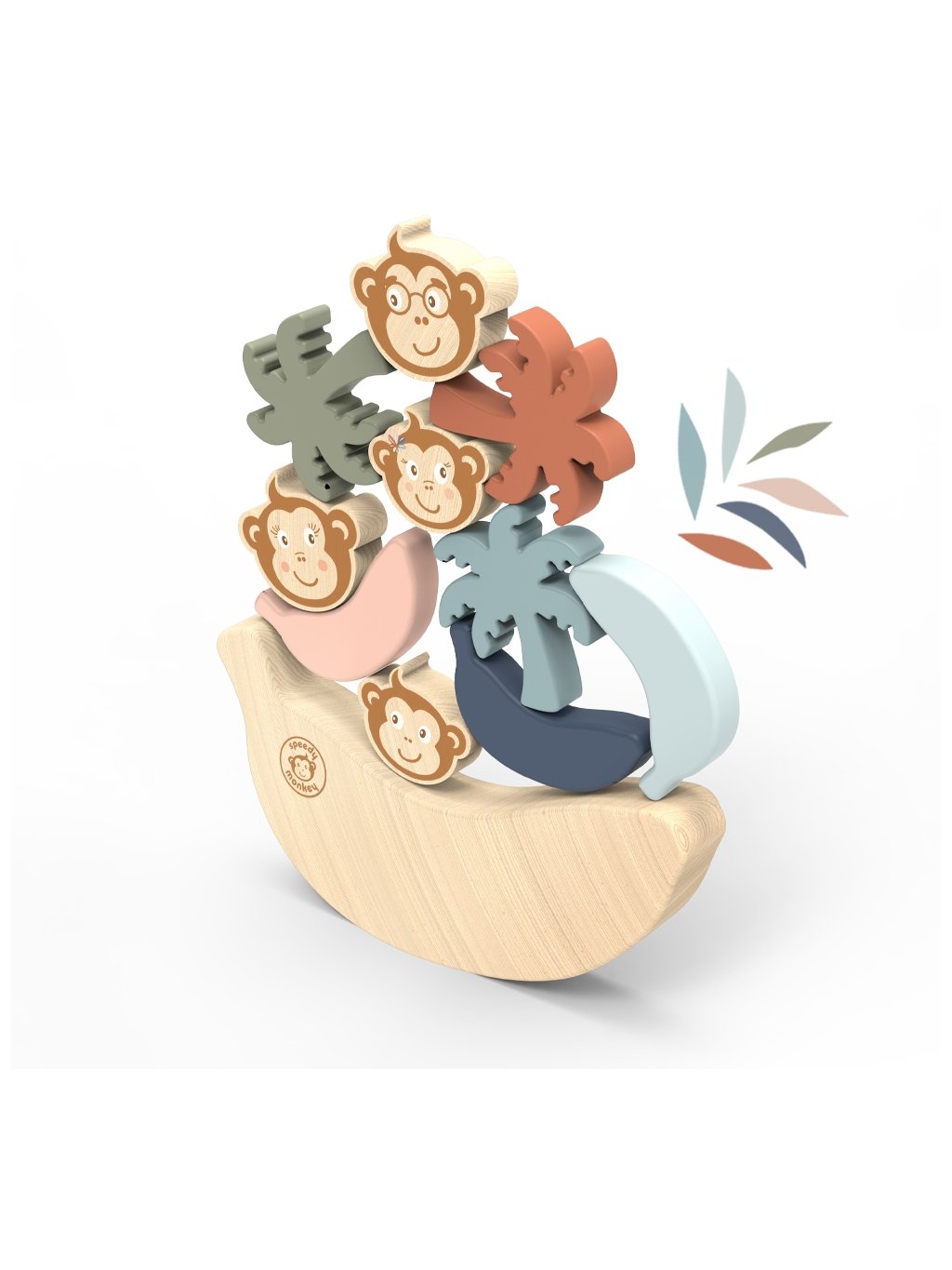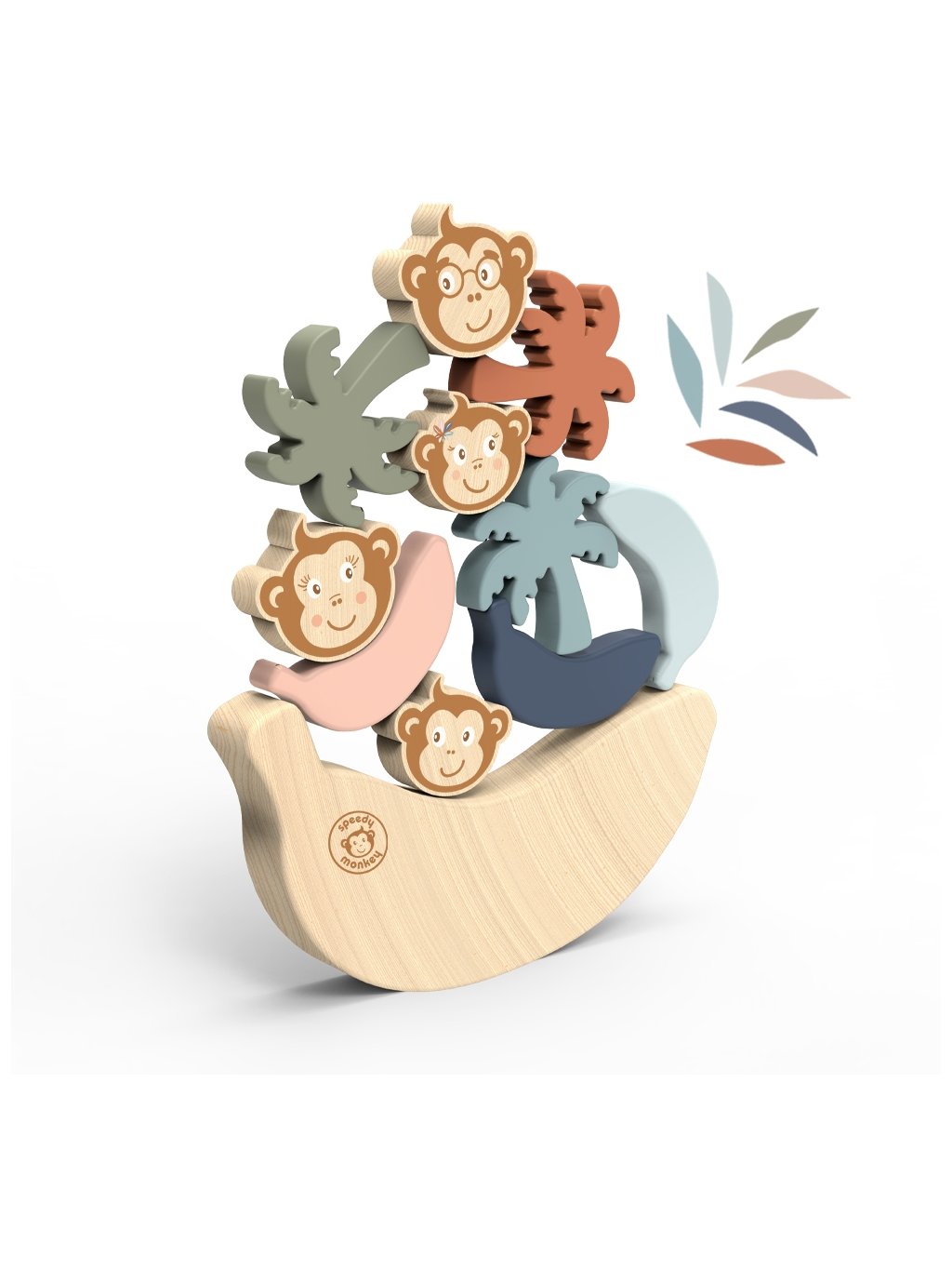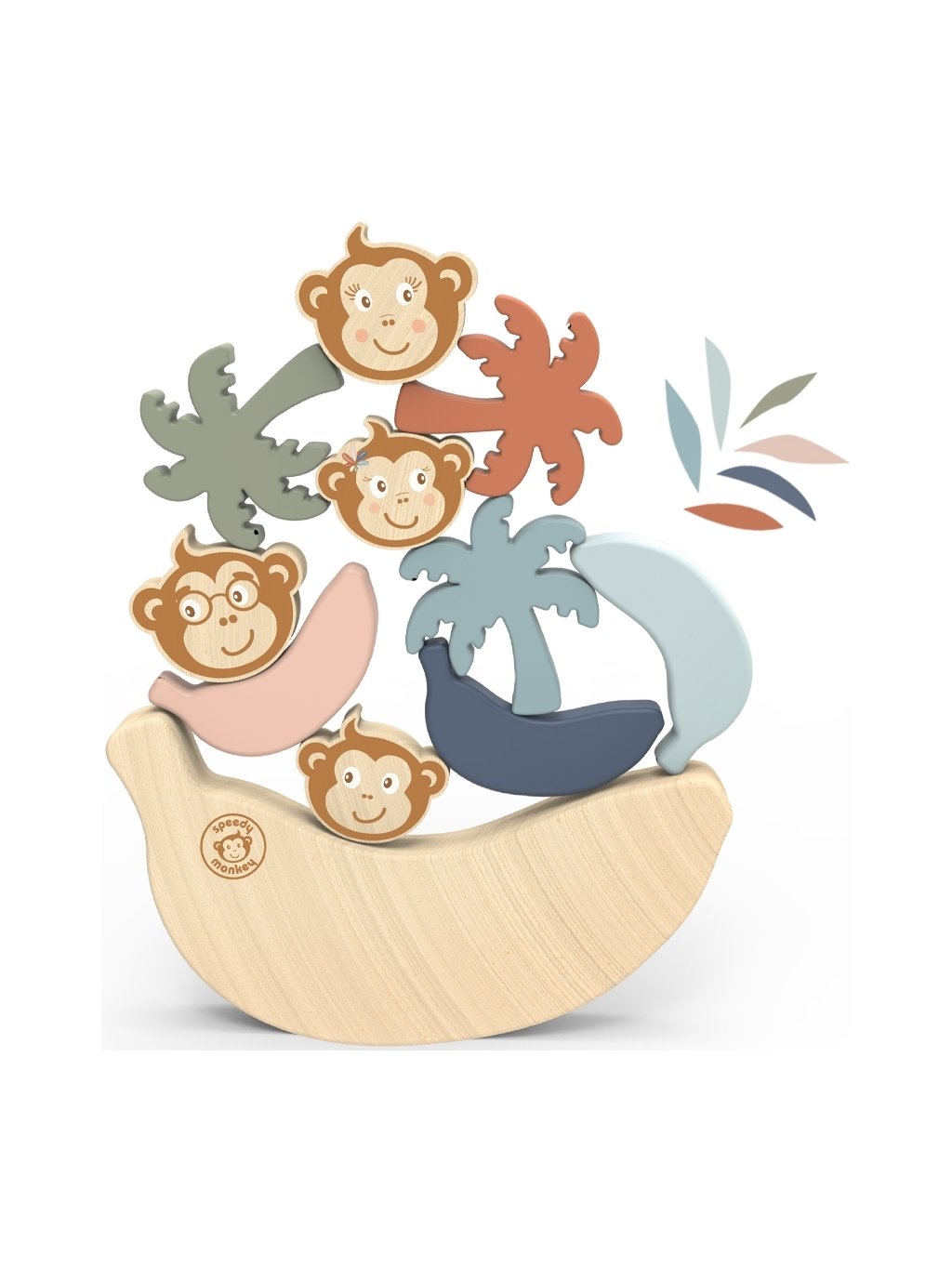 Dřevěná balanční hra Speedy Monkey přináší originální set s barevnými bloky a tvary ve tvaru opic, banánů a palem. Děti si při hře procvičí rozpoznávání barev, porozumění rovnováze a zároveň trénují trpělivost, soustředění, logické myšlení i jemnou motoriku.