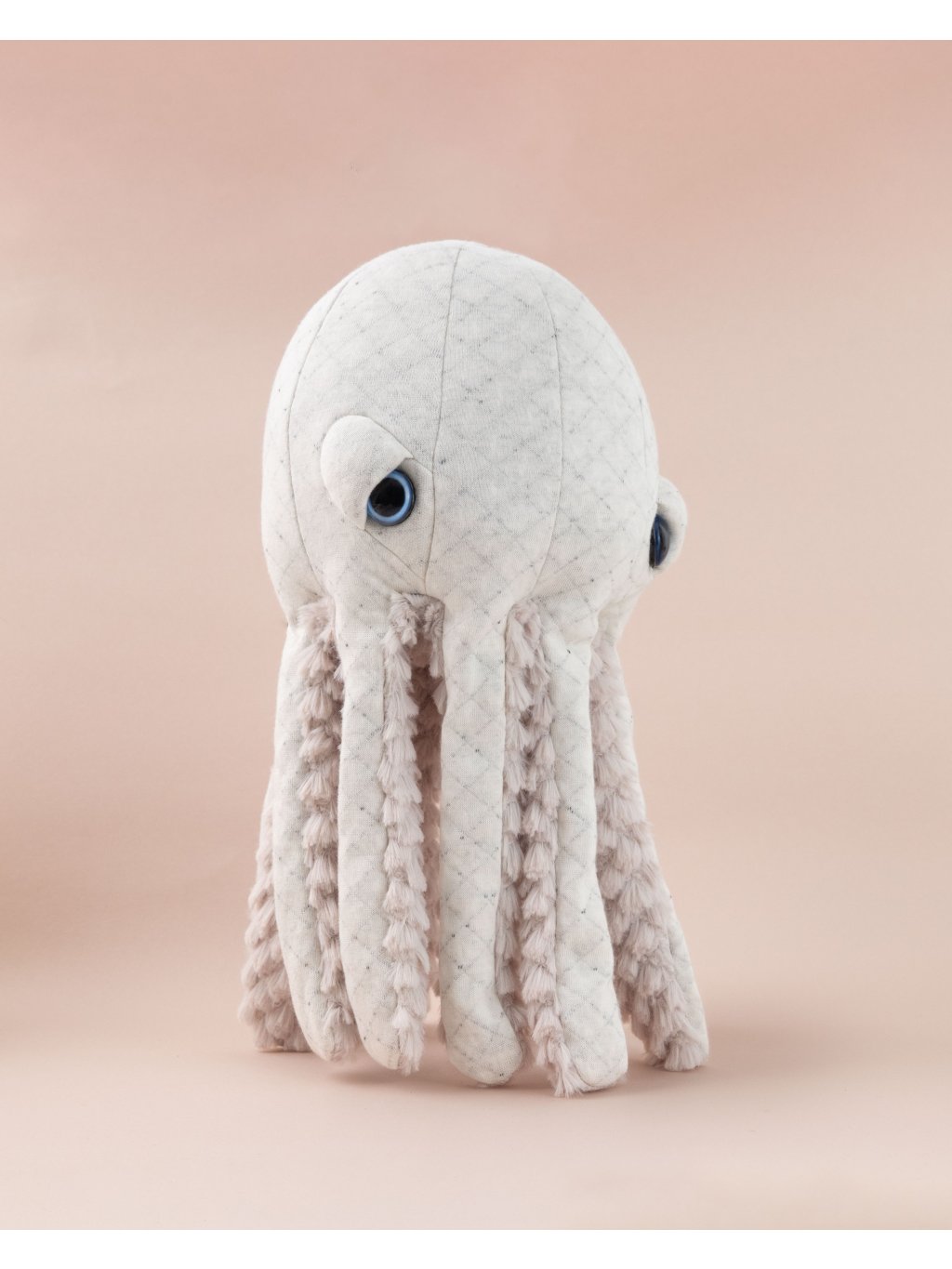Výplň tvoří recyklovaná polyesterová vlákna, která dávají nový život plastu. BigStuffed dbá na dlouhou životnost svých hraček a odpovědný přístup k výrobě. Každá chobotnice je navíc balena do originálního textilního vaku vyrobeného ve Francii.